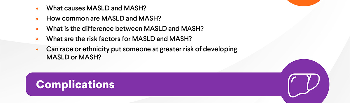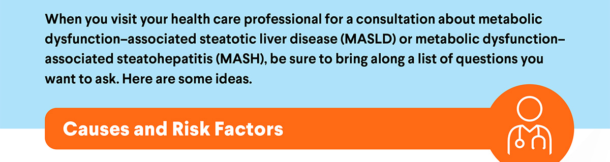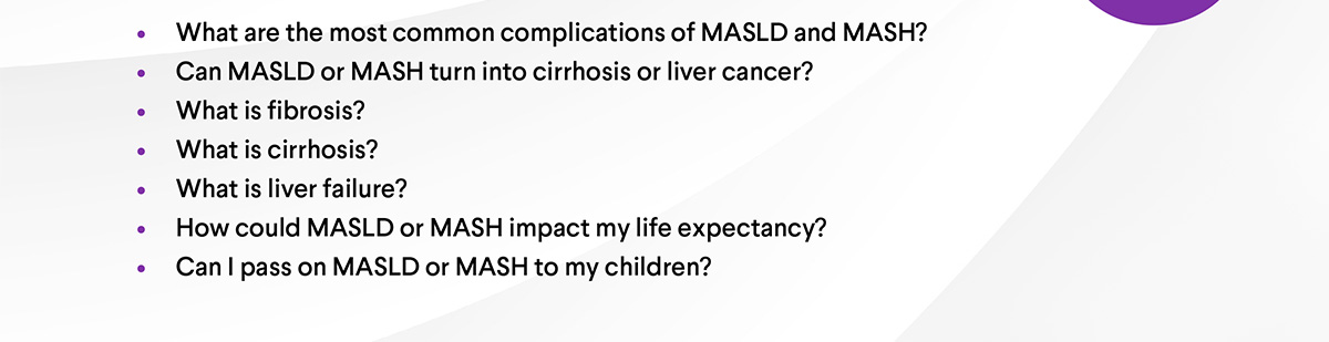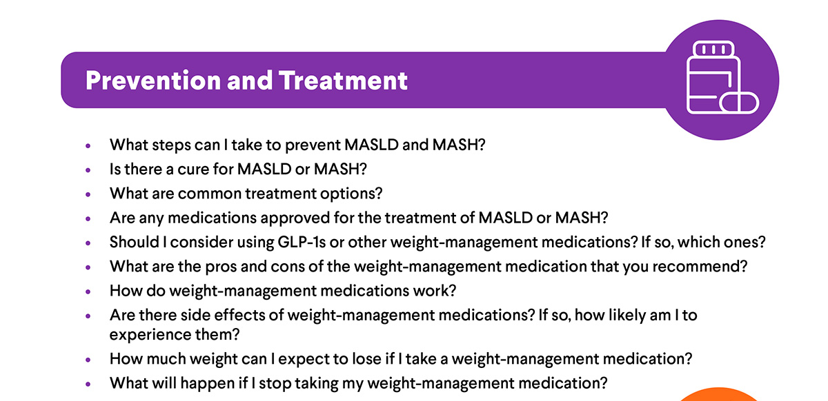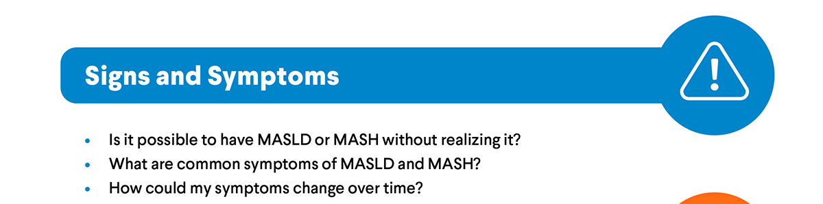 MASLD and MASH often have no early symptoms, which is why regular screening and open conversations with your health care professional are so important. Prepare by reviewing common questions you can ask at your next appointment.