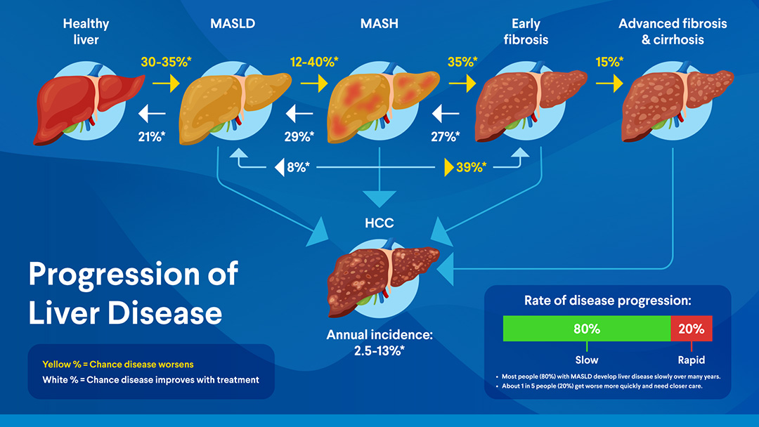 MASLD and MASH can lead to more serious complications, such as fibrosis (scar tissue in the liver). Fibrosis can progress to cirrhosis (severe scarring in the liver).